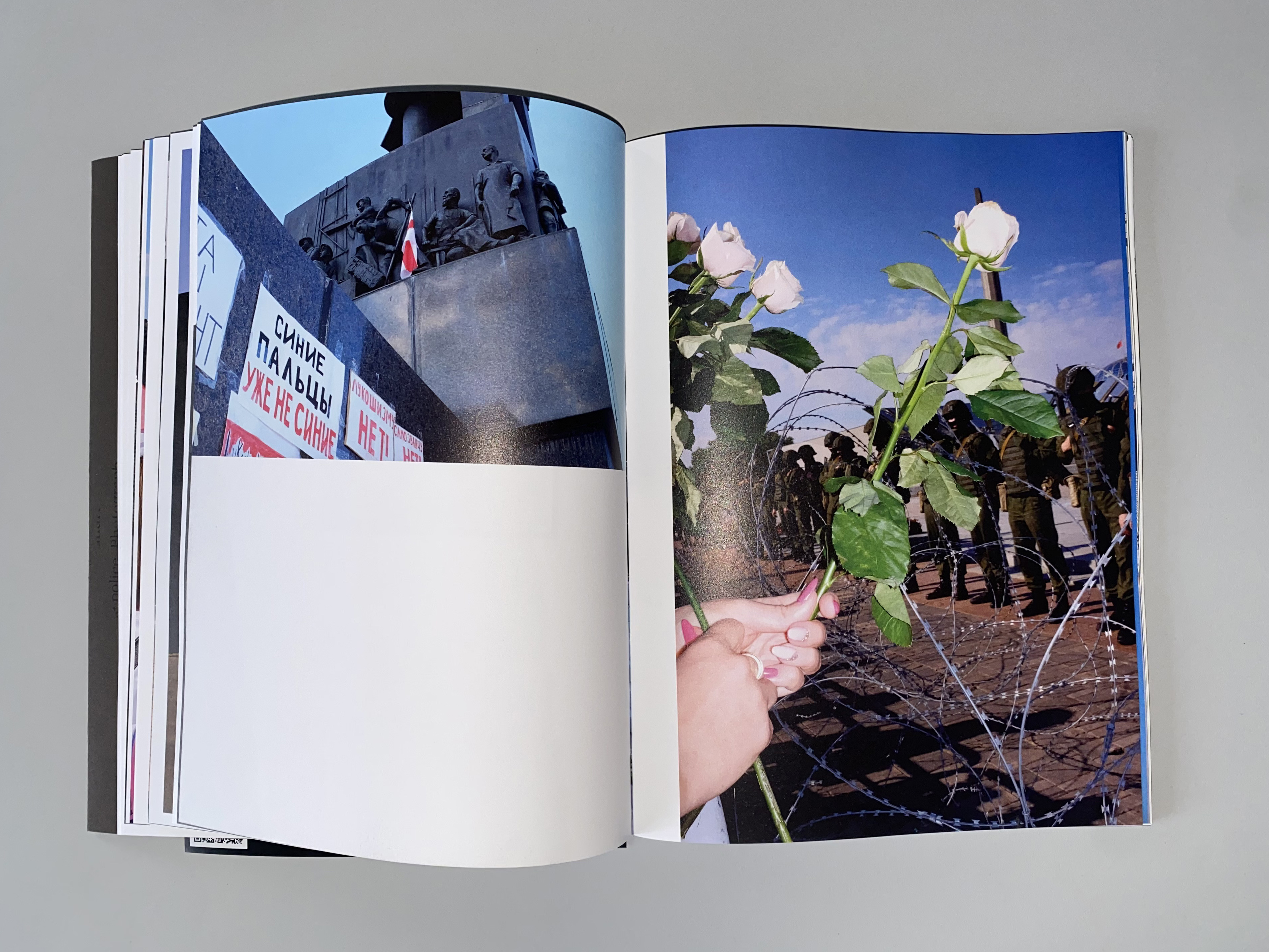 Lesia Pcholka: When working with the history of Belarus, I try not to confine myself into an exclusively Belarusian narrative. Descent into the Marsh draws a parallel between the protests of 2019-2020 in Hong Kong, and 2020-2021 in Belarus- two examples of modern revolutions which were beautiful and powerful in their essence but ultimately failed to achieve their aims. The book is structured into seven chapters illustrated by my photographs: images of the 2020 Belarusian protests, and the empty, but deeply symbolic, protest streets of Hong Kong in 2024. In the text, I draw attention to tactics and symbols: gestures of unity, the symbolic use of colour, and objects such as umbrellas that became symbols of everyday resistance. I also examine the exchange of repressive practices between the regimes in China and Belarus, with a focus on the role of surveillance technologies.